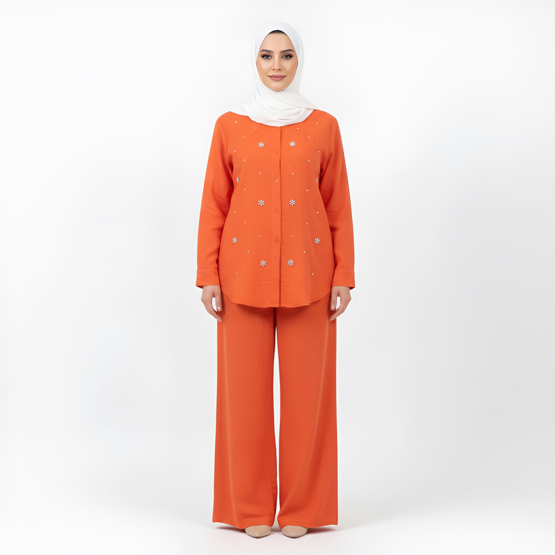 Beaded Long Sleeve Shirt & Wide Leg Pants Set