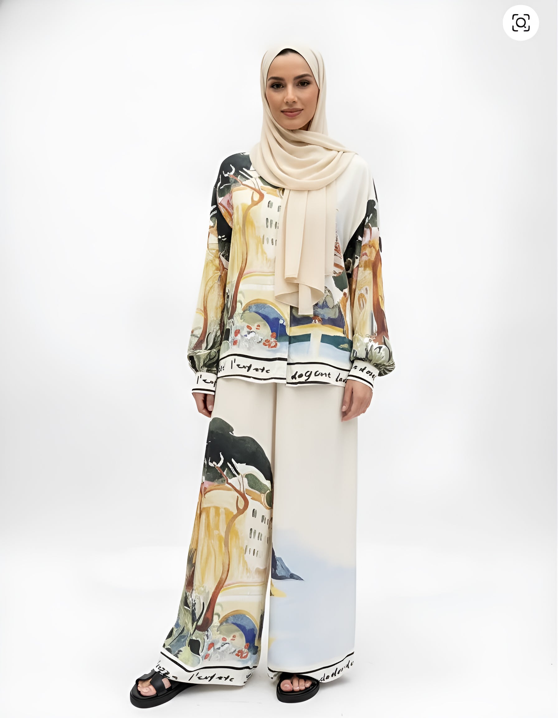 Fashion Printed Long Sleeve Shirt & Wide Leg Pants Set